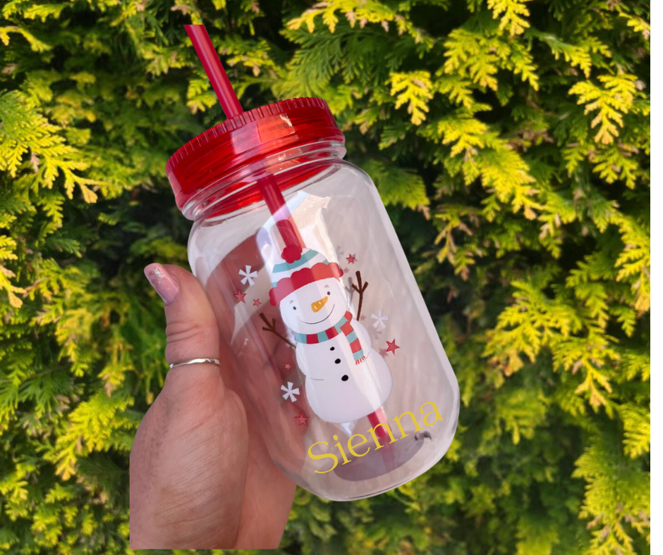 Sip in festive style with this adorable Christmas Plastic Cup with Straw – perfect for kids’ parties, Christmas gifts 🎁, or a fun winter treat! Each reusable 500ml jar comes with a red & white striped straw, screw lid, and can be personalised with any name for that extra special touch 💖